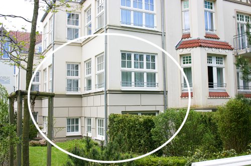 Blick von der Ostseeallee. Die Wohnung erstreckt sich über 2 Etagen, vor dem Schlafzimmer in Paterre befindet sich eine von Grünpflanzen umgebene Terrasse.
